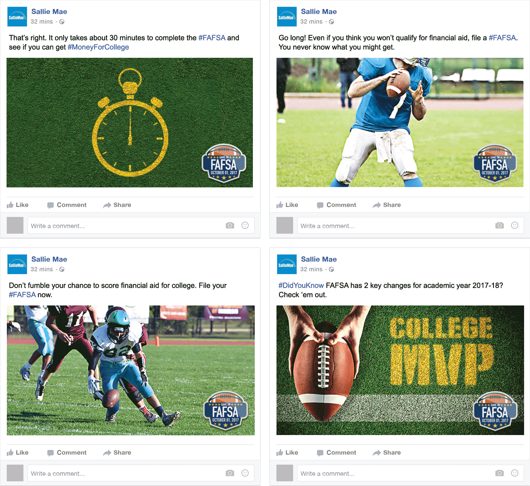 For the 2017 FAFSA campaign I worked with a copywriter to develop an integrated campaign to remind families of the kickoff of FAFSA season and provide information to help them have a winning experience filing out the application. Since 2017 was the second year with the earlier October 1st start date we were able to reinforce the idea that federal financial aid is a “win” for families paying for college by comparing the FAFSA to the ultimate fall classic: football.